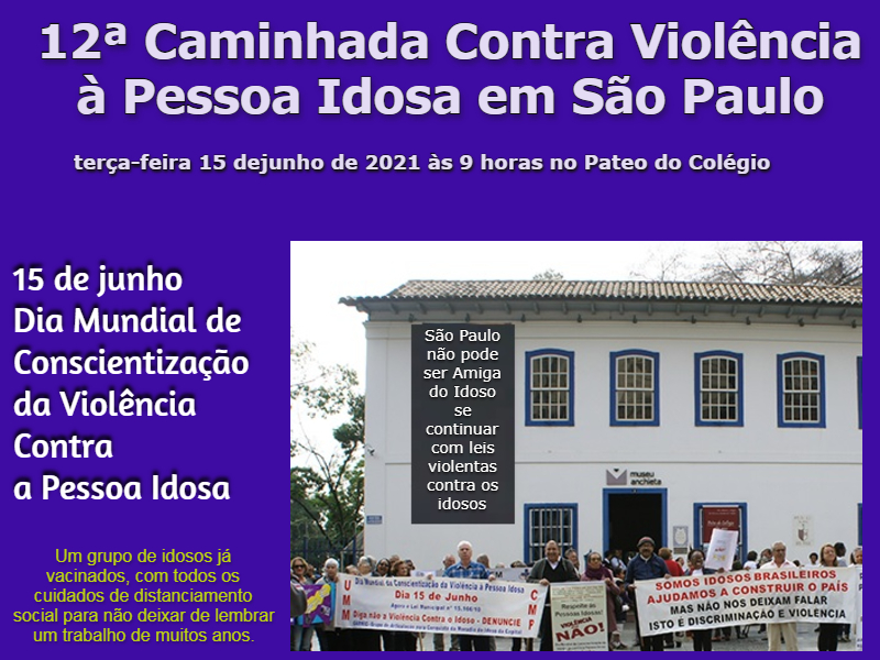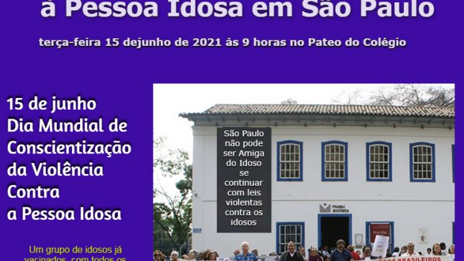 Embora pelo segundo ano consecutivo tenha que fazer adaptações, em função da pandemia da Covid19, um grupo de idosos, já imunizados, estará no Pateo do Colégio, a partir das 9 horas, para a manifestação que pretende chamar a atenção contra a violência aos idosos, na cidade de São Paulo.