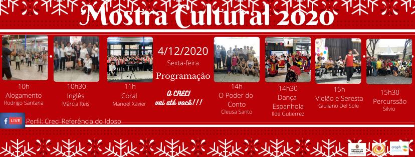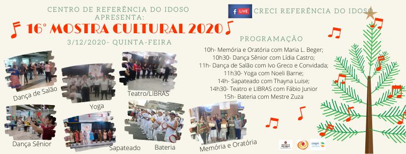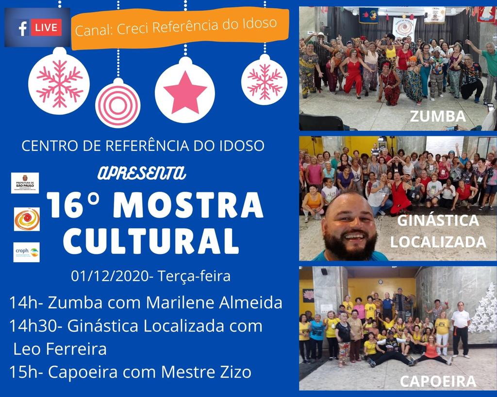 Começa amanhã (1/12) a 16ª Mostra Cultural do CRECI- Centro de Referência da Cidadania do Idoso, órgão da Prefeitura de São Paulo, único na Região Centro, instalado na Rua Formosa nº 215, no Vale do Anhangabaú, que está fechado para atendimento presencial, devido a pandemia.