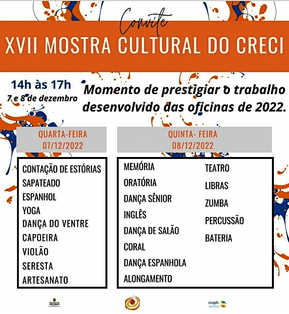 O Centro de Referência da Cidadania do Idoso (CRECI), órgão da Prefeitura de São Paulo, instalado na Rua Formosa nº 215, no Vale do Anhangabaú, realizará a sua 17ª Mostra Cultural, nos dias 7 e 8 de dezembro, das 14 às 17 horas.