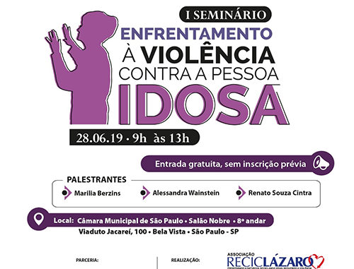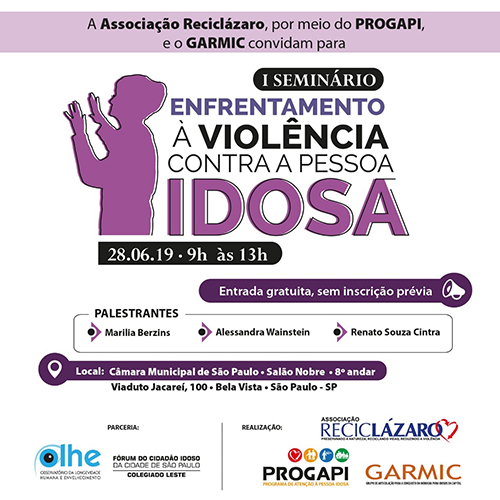 No próximo dia 28 de junho, a Associação Reciclázaro, por meio do PROGAPI, e o GARMIC realizam seu primeiro seminário para conscientização e enfrentamento sobre os diversos e recorrentes tipos de agressões contra a pessoa idosa. Coação, maus-tratos físicos e psicológicos, negligência, privação à liberdade e abuso econômico são algumas formas de violência a serem combatidas dentro e fora dos lares.