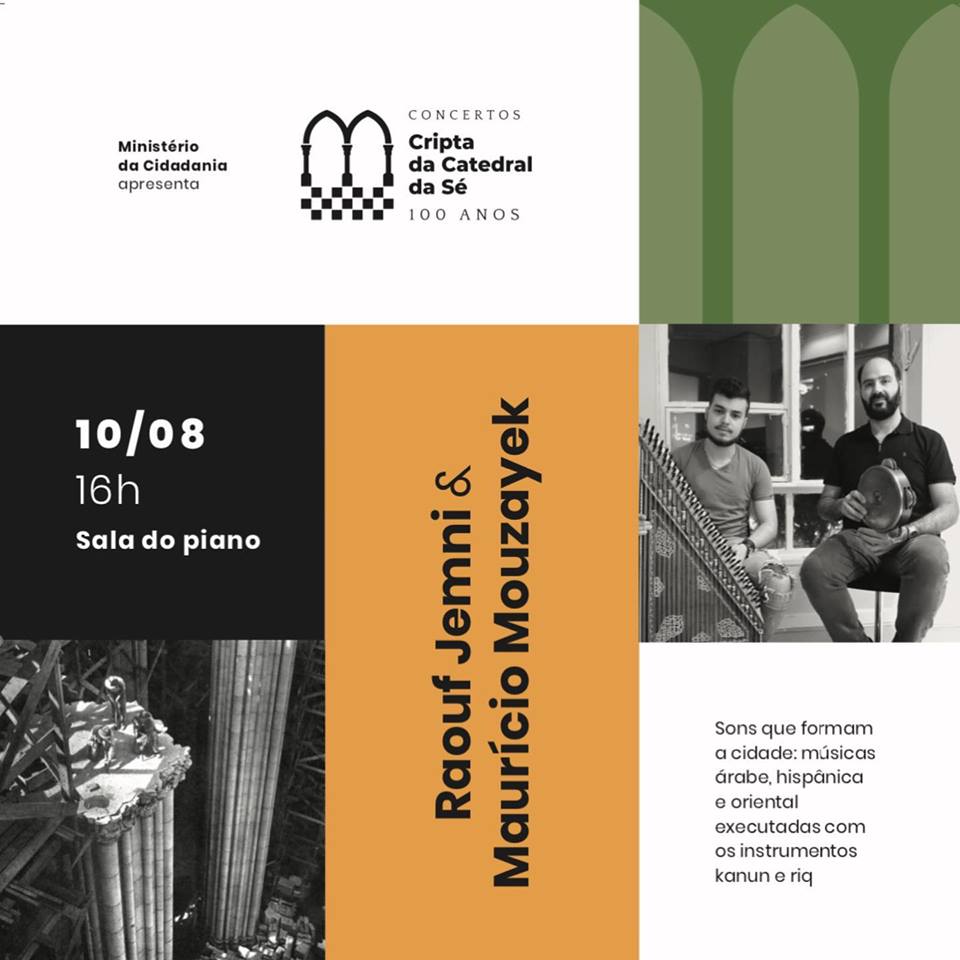 Dando continuidade ao “Projeto Cem Anos da Cripta da Catedral da Sé”, lançando em julho, oferecendo uma programação continua todos os sábados, gratuitamente, no próximo sábado 10 de agosto será a vez do Duo Raouf Jemni e Mauricio Mouzayek.