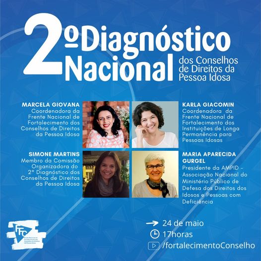 A Frente Nacional de Fortalecimento dos Conselhos de Direitos da Pessoa Idosa lançará na segunda-feira, 24 de maio, às 17 horas,  seu 2° Diagnóstico Nacional dos Conselhos de Direitos da Pessoa Idosa.
