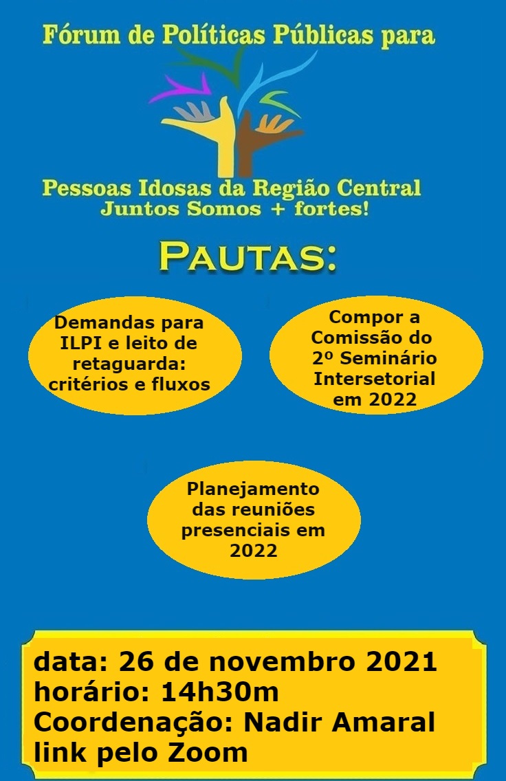 Fórum para Pessoas Idosas da Região Centro faz reunião de novembro em 26/11 24/11/2021 Hermínia Brandão CONSELHOS E FÓRUNS DE IDOSOS SP, Sé e Região- Capital SP 0 O Fórum Permanente de Políticas Públicas Para Pessoas Idosas da Região Centro, da Capital, em São Paulo, marcou a sua reunião de novembro de 2021, para a sexta-feira, 26/11, às 14h30. O link da reunião pela plataforma Zoom Fórum Centro Capital