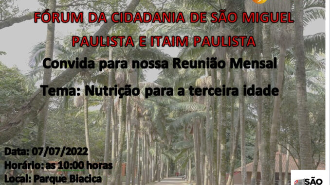 O Fórum da Cidadania de São Miguel Paulista e Itaim Paulista, vai realizar no próximo dia 7 de julho, às 10 horas, nas dependências do Parque Biacica, de forma presencial, seu encontro mensal, com o tema “Nutrição na terceira idade”.