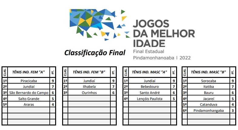 O Tênis individual foi a modalidade com menor participação de atletas nos Jogos Estaduais da Melhor Idade de SP, realizados de 8 a 13 de julho em Pindamonhangaba. Foram 11 atletas homens e 9 mulheres, nas categorias A e B.