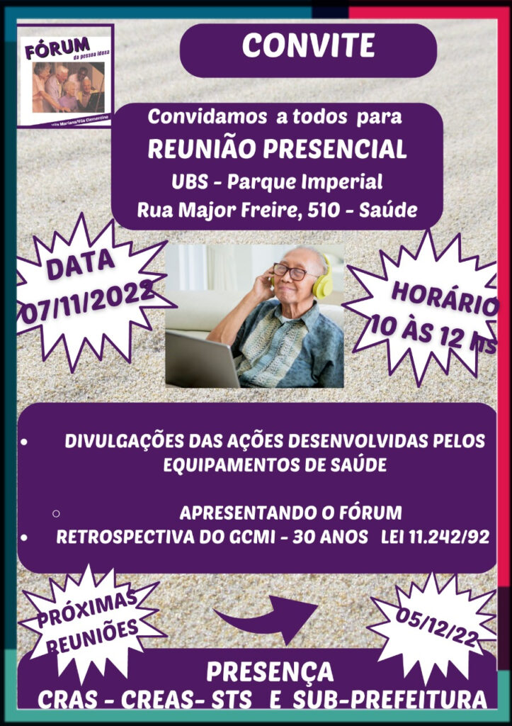 O Fórum da Pessoa Idosa da Vila Mariana e Vila Clementino, da Zona Sul da Capital, em São Paulo, faz hoje, 7/11, a sua reunião mensal presencial, desta vez na UBS Parque Imperial, no bairro da Saúde e, que fica na Rua Major Freire, 510.