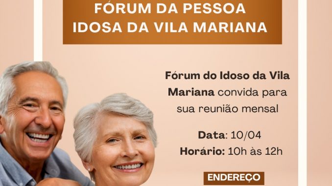 O Fórum da Pessoa Idosa da Vila Mariana e Vila Clementino, da Zona Sul da Capital, em São Paulo, faz hoje segunda-feira, 10 de abril, a sua reunião mensal, desta vez na sede da Associação Comercial da Vila Mariana.