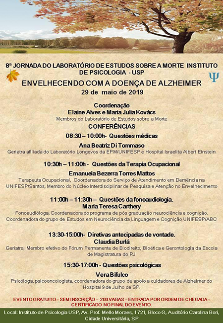 O Instituto de Psicologia da USP promove no próximo dia 29 de maio a 8ª Jornada do Laboratório de Estudos sobre A Morte que em 2019 tem como tema o “Envelhecendo com a doença de Alzheimer”.