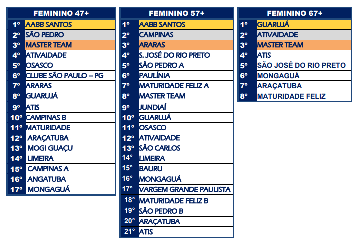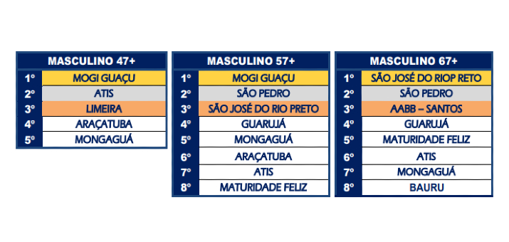 Segundo o regulamento, foram 6 categorias: feminino 47+ (para nascidas entre 1966 e 1975); feminino 57 + (para nascidas entre 1956 e 1965); feminino 67 + (para nascidas até 1955); masculino 47+ (para nascidos entre 1966 e 1975); masculino 57 + (para nascidos entre 1956 e 1965) e masculino 67+ (para nascidos até 1955).