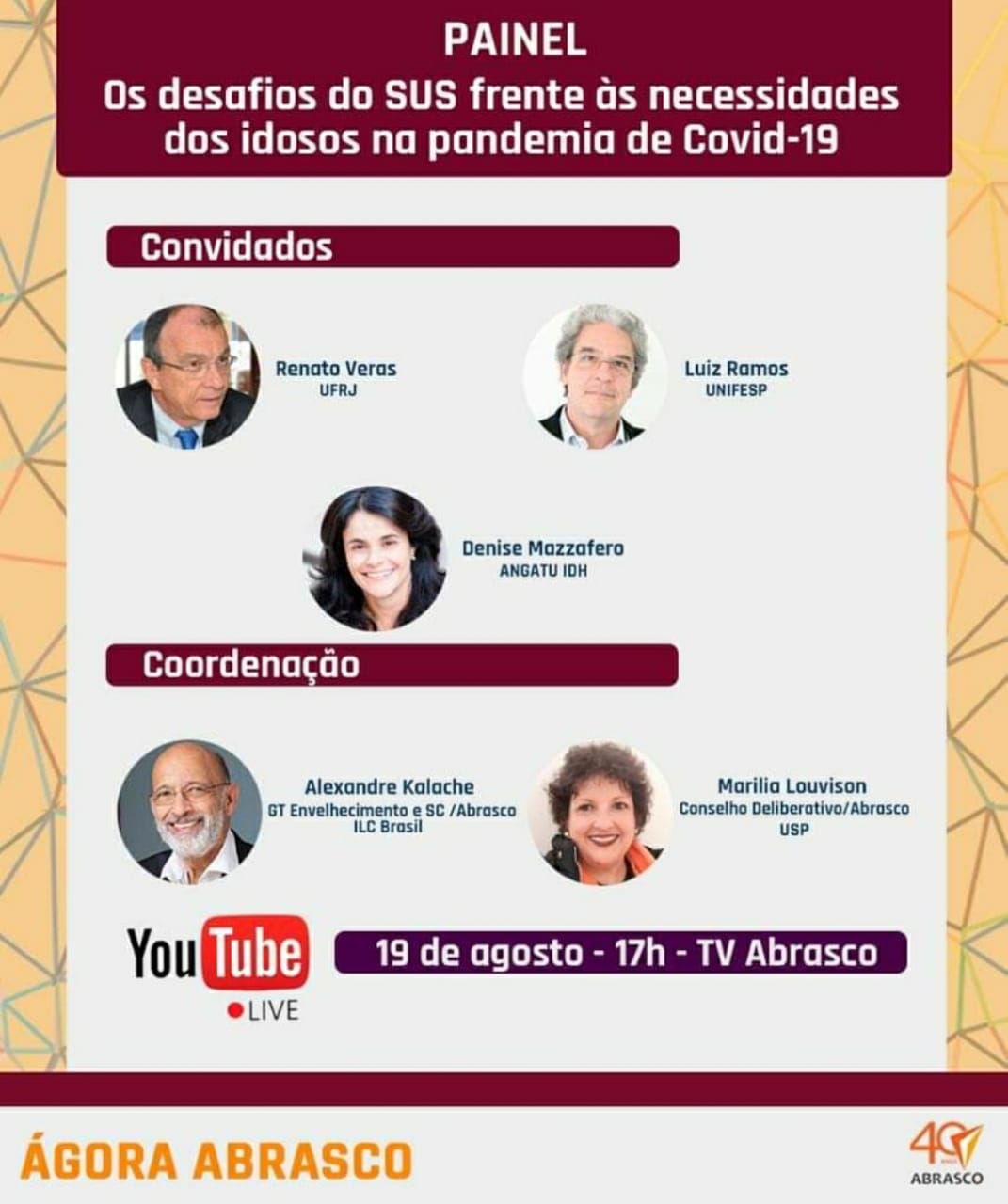 O Grupo Temático Envelhecimento e Saúde Coletiva da ABRASCO- Associação Brasileira de Saúde Coletiva, promove amanhã, 19 de agosto, um debate virtual com o tema Os desafios do SUS frente às necessidades dos idosos na pandemia do Covid-19 , pelo canal da entidade no Youtube.