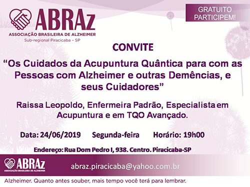 A Regional de Piracicaba da ABRAz- Associação Brasileira de Alzheimer, que é coordenada pela terapeuta ocupacional Lívia Baltieri, promove hoje, segunda-feira, 24 de junho de 2019, a partir das 19 horas, mais um encontro do Grupo de Apoio Psicológico aos Familiares e Cuidadores de Pessoas com a Doença de Alzheimer.