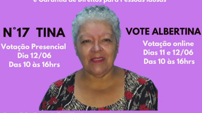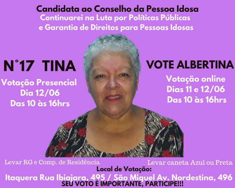 Albertina Souza Ribeiro Justino é candidata a conselheira na próxima eleição do GCMI- Grande Conselho Municipal do Idoso de São Paulo. Ela quer ser representante da Zona Leste. Seu número é 003/017.