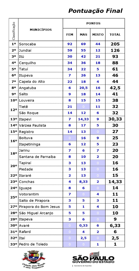 Itu ficou em 3° lugar com 93 pontos, sendo 30 no feminino, 42 no masculino e 21 no misto.
