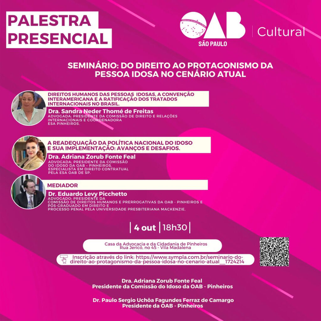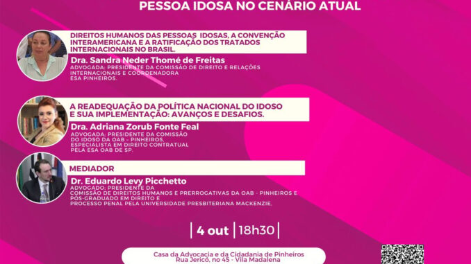 A Comissão de Direitos da Pessoa Idosa da OAB- Ordem dos Advogados do Brasil, Seção Pinheiros, na Região Oeste da capital, em São Paulo, presidida pela advogada Adriana Zorub Fonte Feal, faz hoje a noite, 4/10, de forma presencial uma palestra sobre envelhecimento.