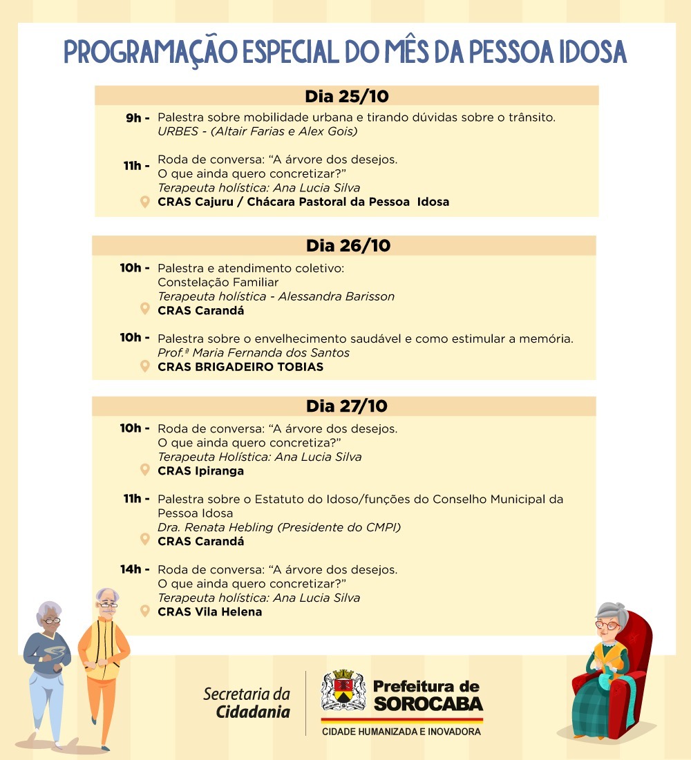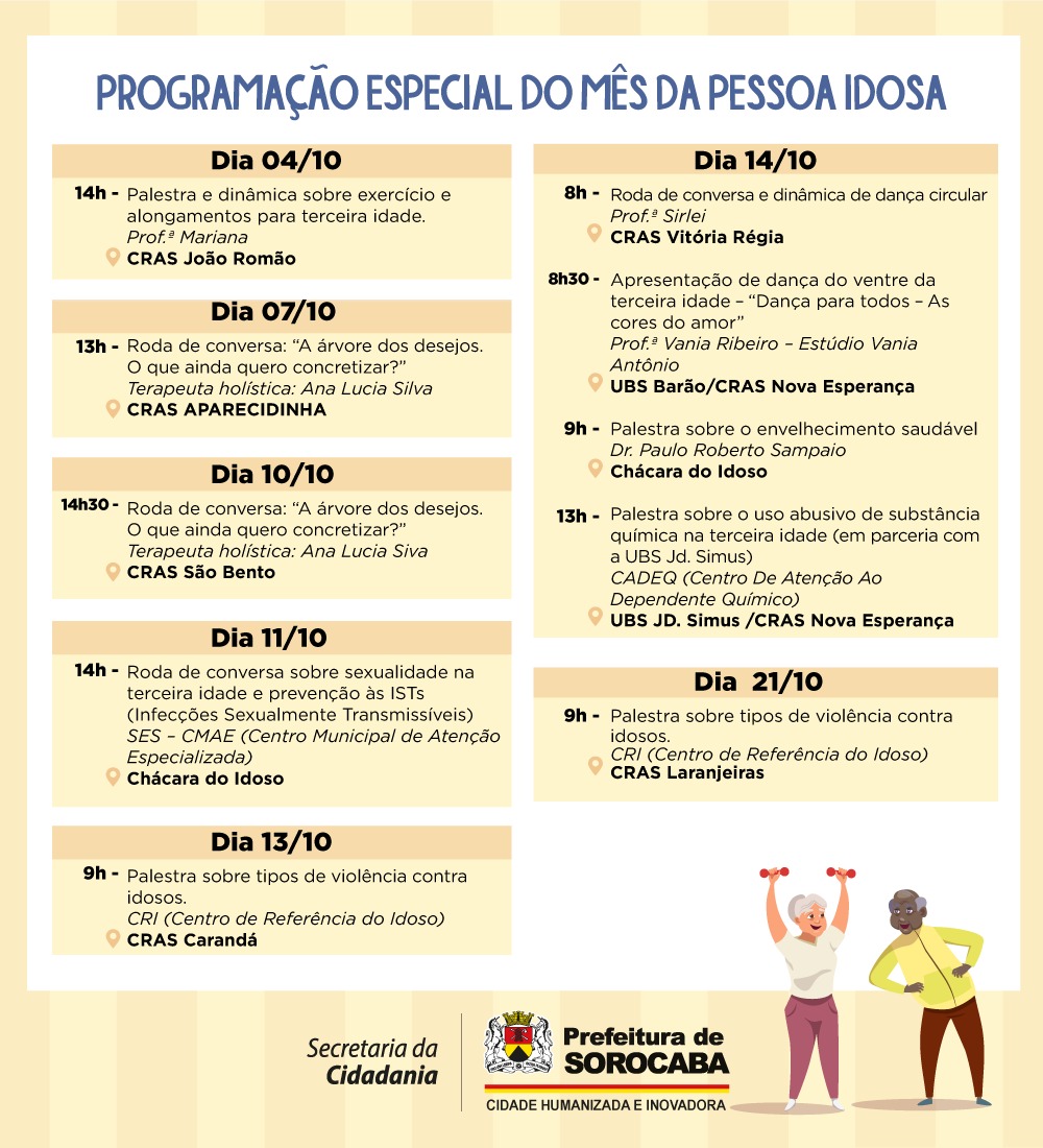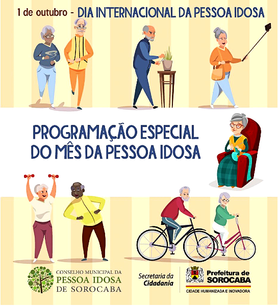 O Conselho Municipal da Pessoa Idosa de Sorocaba (CMPI) e a  Coordenadoria do Idoso local programaram uma série de atividades, ao longo do mês de outubro, em alusão ao Dia Internacional da Pessoa Idosa, comemorado no último sábado, 1º de outubro.