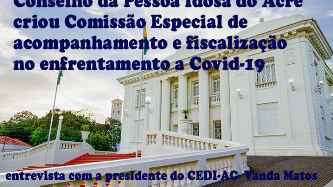 Vanda Matos de, presidente do CEDI-AC– Comissão Especial de Acompanhamento e Fiscalização no enfrentamento ao COVID- 19 em Instituições de Longa Permanência do Estado do Acre foi criada pelo Conselho Estadual dos Direitos da Pessoa Idosa do Acre, por meio da Resolução n° 005, de 27 de abril de 2020. Ela é composta por conselheiros do CEDI, por representantes do Ministério Público, da Defensoria Pública, do Departamento da Vigilância Sanitária Estadual e Municipal, do Conselho Municipal do Idoso de Rio Branco, das secretarias Estadual e Municipal de Saúde e presidente de uma ILPI da Capital.