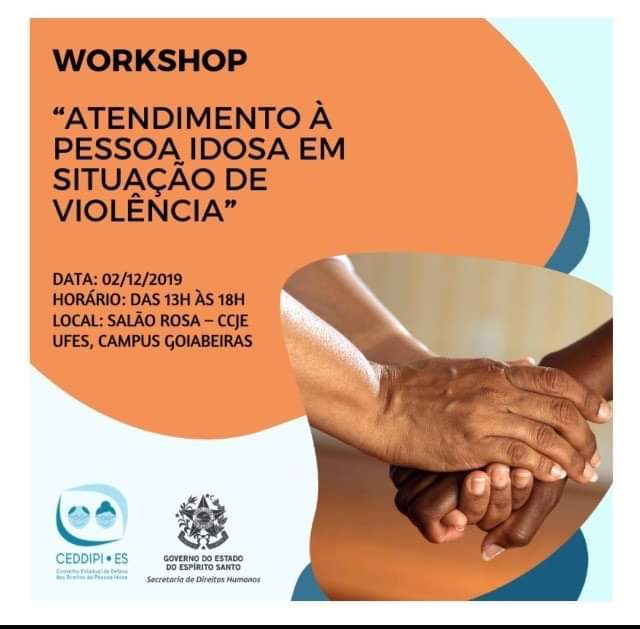 O Conselho Estadual dos Direitos da Pessoa Idosa do Espírito Santo marcou para o dia 2 de dezembro de 2019, das  13 às 17 horas, no Campus Goiabeiras, da Universidade Federal do Espírito Santo uma oficina sobre Atendimento da Pessoa Idosa em situação de Violência, em parceria com MPES, Delegacia Especializada de Atendimento a Pessoa Idosa, CREAS, Conselhos Municipais, Saúde, Defensoria Pública, Secretarias Municipais e Secretaria Estadual de Direitos Humanos.