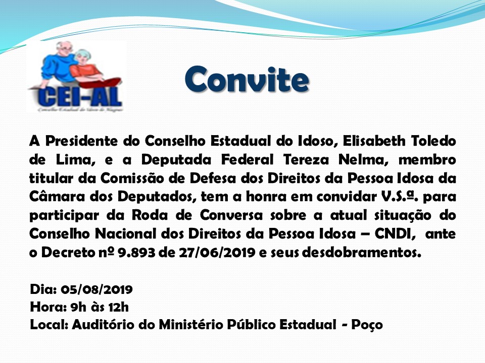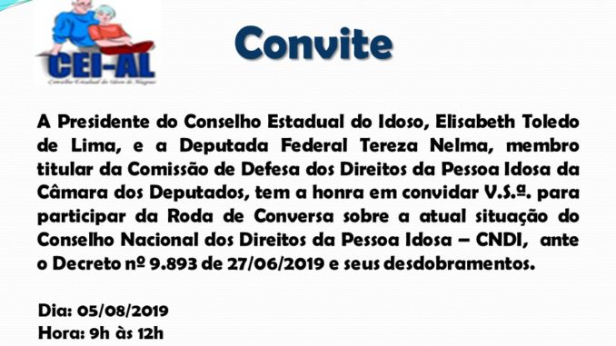 O Conselho Estadual do Idoso de Alagoas, presidido pela assistente social Elisabeth Toledo de Lima, com apoio da Deputada Federal Tereza Nelma, membro da CIDOSO, marcou para a manhã da próxima segunda-feira, 5 de agosto, no auditório do Ministério Público Estadual, uma reunião para debater a situação do CNDI – Conselho Nacional dos Direitos da Pessoa Idosa.