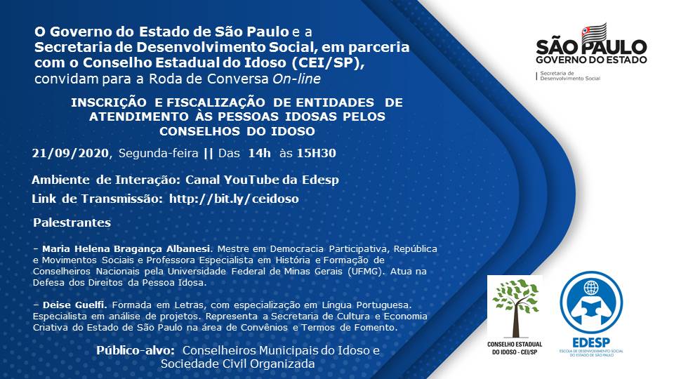O Conselho Estadual do Idoso de SP faz hoje, segunda-feira, dia 21 de setembro, das 14 às 15h30, mais um encontro virtual, da série de roda de conversa com os conselhos municipais do Estado, através da página da EDESP – Escola de Desenvolvimento Social do Estado de São Paulo, no Youtube.