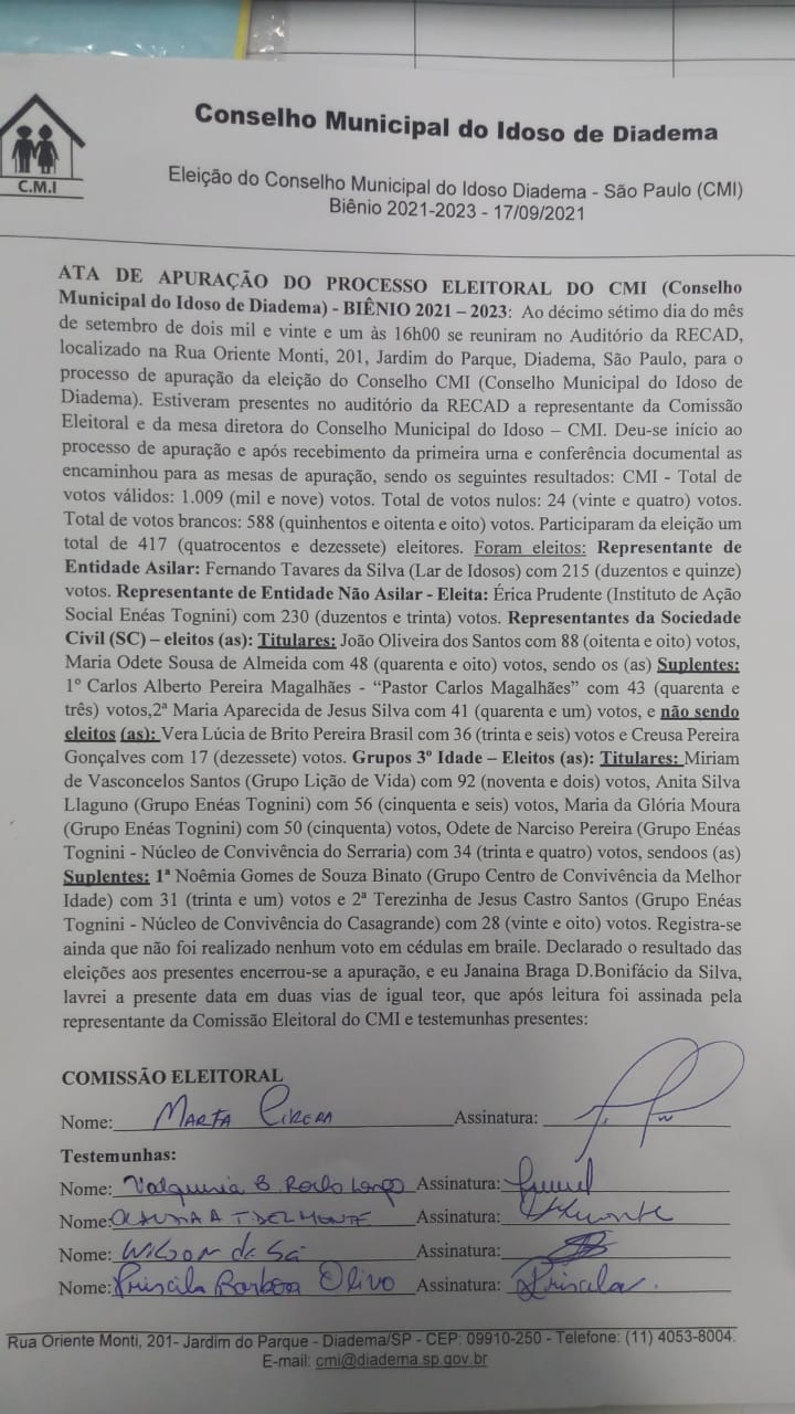 O Conselho Municipal do Idoso de Diadema, na Grande São Paulo, elegeu na última sexta-feira (17/9) os novos conselheiros da sociedade civil, para a gestão 2021-2023.