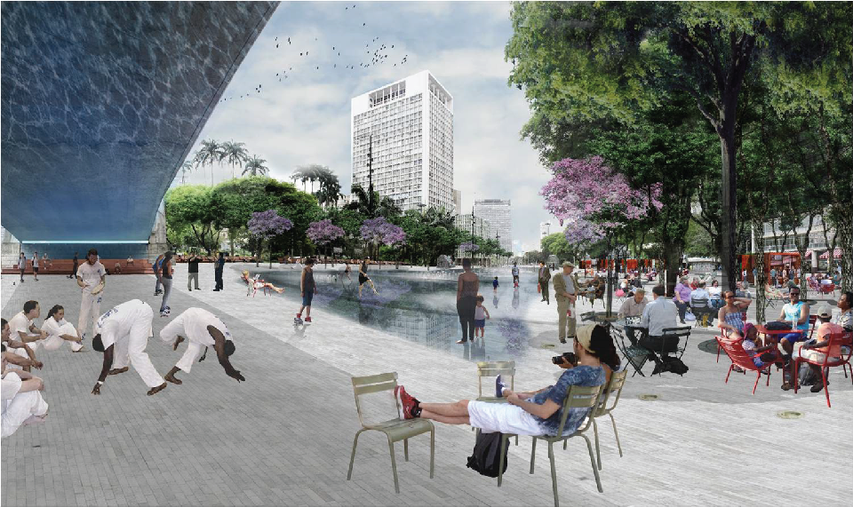 Ilustração Reforma do Vale do Anhangabaú Na ilustração do projeto de Reforma do Vale do Anhangabaú, a pessoa sentada e os capoeiristas estão exatamente na calçada do CRECI.