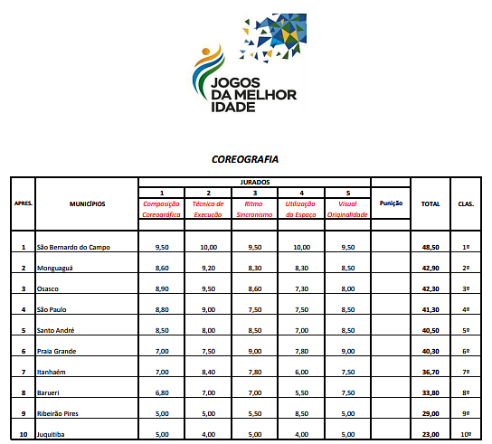 Dez cidades disputaram a modalidade Coreografia: São Bernardo do Campo, Mongaguá, Osasco, São Paulo, Santo André, Praia Grande, Itanhaém, Barueri, Ribeirão Pires e Juquitiba.