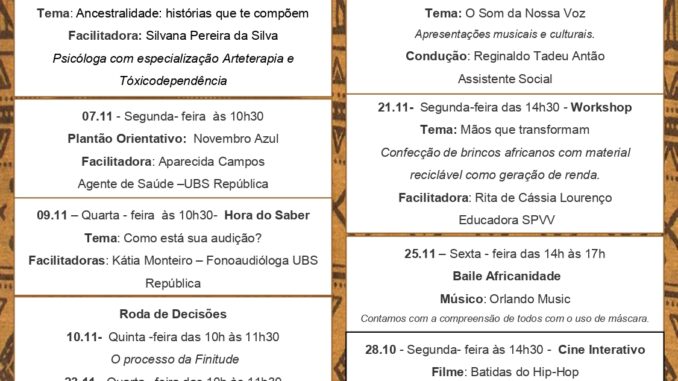 O CRECI-Centro de Referência e Cidadania do Idoso, que fica nos baixos do Viaduto do Chá, no Anhangabaú, na Rua Formosa nº 215, com atendimento gratuito para as pessoas idosas, divulgou sua programação de novembro de 2022.