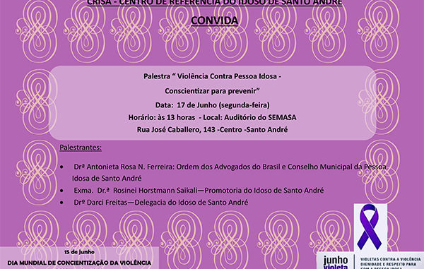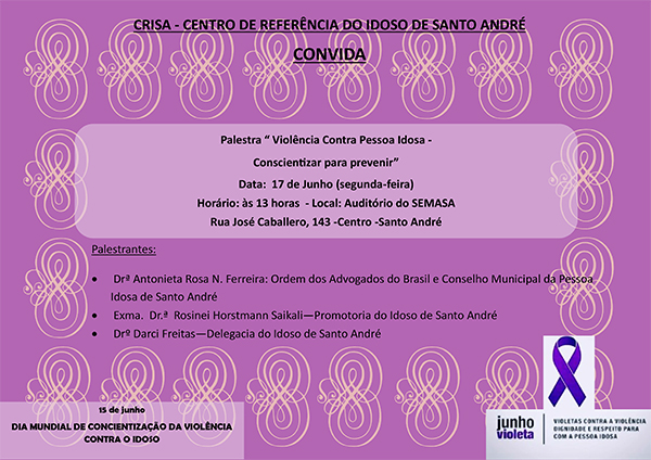 O CRISA- Centro de Referência do Idoso de Santo André, na Grande São Paulo, está convidando para a palestra que vai promover na segunda-feira 17 de junho, às 13 horas, no auditório da SEMASA- Serviço Municipal de Saneamento Ambiental de Santo André.