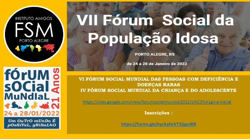 Estão abertas as inscrições para a participação nas oficinas e na programação do 7º Fórum Social Mundial da População Idosa que está marcado para o período de e 24 a 28 de janeiro de 2022, no Rio Grande do Sul.