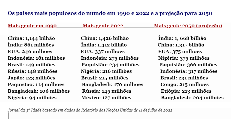 O Brasil, mesmo sem os números atuais do IBGE, chegou em 2022 como o sétimo mais populoso. Em 1990 éramos a quinta maior população do mundo.
