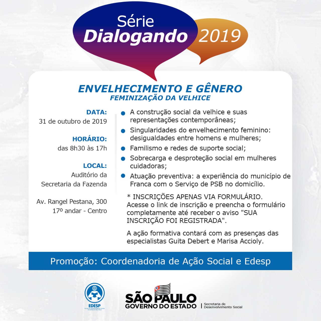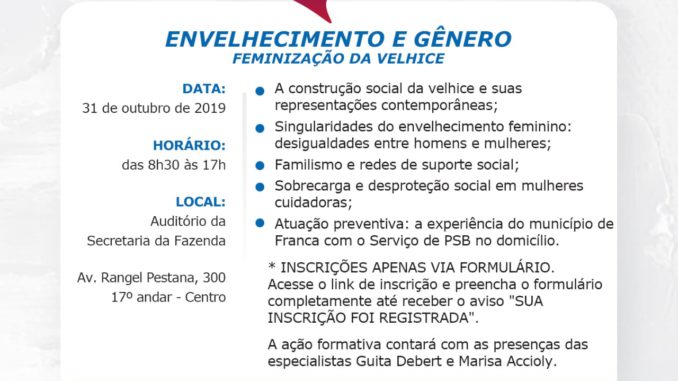 Envelhecimento e Gênero: Feminização da Velhice é o tema do próximo encontro da série “Dialogando 2019”, promovida pela Secretaria Estadual de Desenvolvimento Social e pela EDESP- Escola de Desenvolvimento Social do Estado de SP, no dia 31 de outubro, no auditório da Secretaria da Fazenda, na Rua Rangel Pestana, 300.
