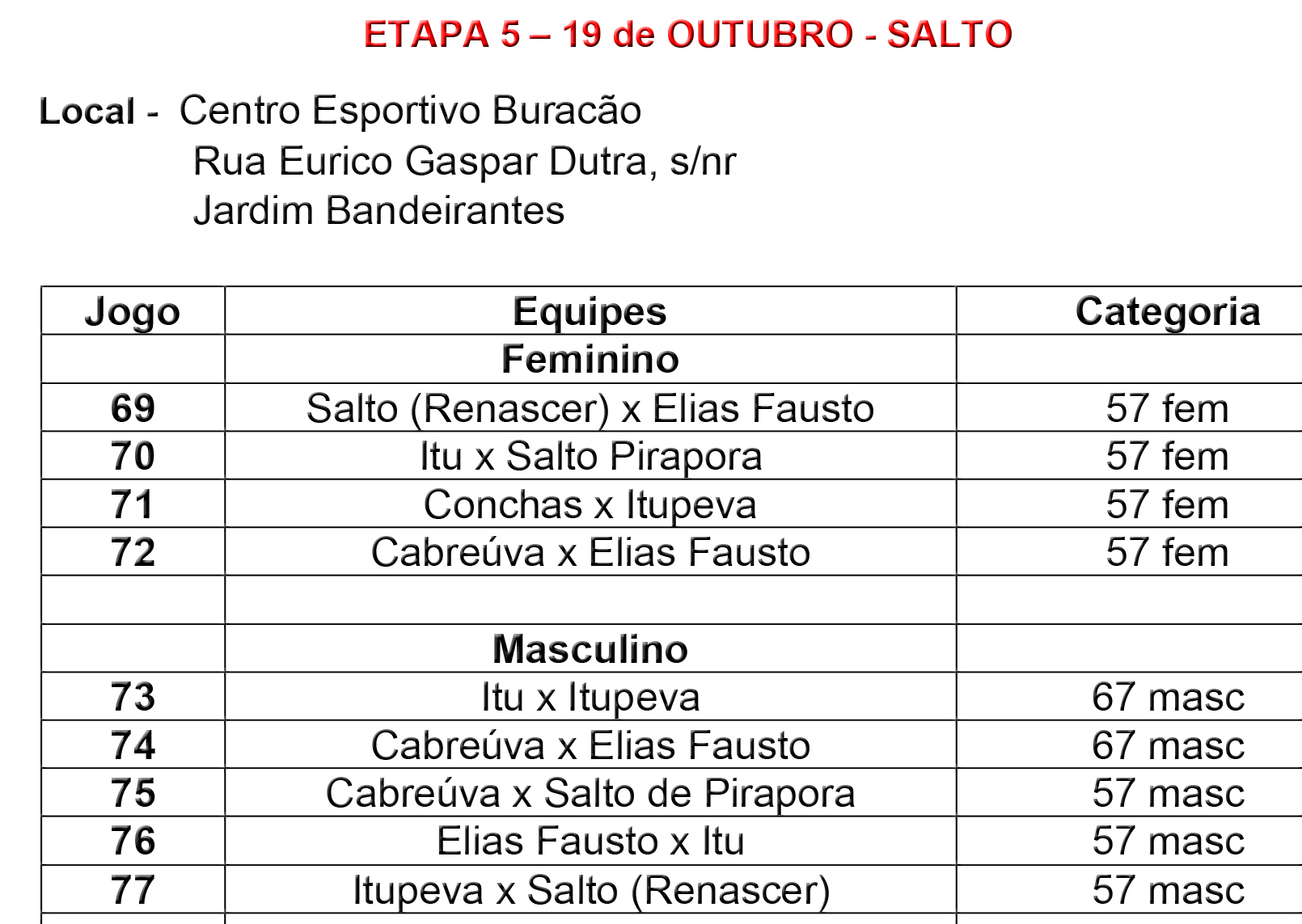 Participam 19 equipes de 7 municípios: Cabreúva, Conchas, Elias Fausto, Itu, Itupeva, Salto e Salto de Pirapora.