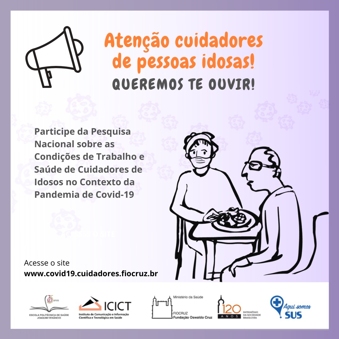 A Fiocruz- Fundação Oswaldo Cruz, uma instituição de pesquisa e desenvolvimento em ciências biológicas localizada no Rio de Janeiro, considerada uma das principais instituições de pesquisa em saúde pública, está realizando a 1ª Pesquisa Nacional sobre Condições de Trabalho e Saúde de Cuidadores de Pessoa Idosa no contexto da Pandemia da Covid-19.