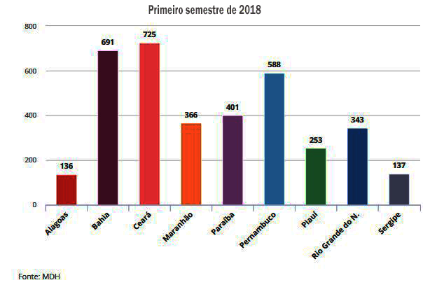 Pelos números divulgados pelo Ministério da Mulher, da Família e dos Direitos Humanos referentes ao primeiro semestre de 2018, referentes as denúncias registradas pelo Disque 100, o Ceará foi o estado do Nordeste com o maior número de registros, com 725 ocorrências.