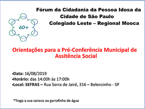 Fórum da Cidadania da Pessoa Idosa da Mooca, SP, faz hoje seu encontro mensal 16/08/2019 Hermínia Brandão CONSELHOS E FÓRUNS DE IDOSOS SP, Mooca e Região- Capital SP 0 O Fórum da Cidadania da Pessoa Idosa da Mooca faz hoje a sua reunião mensal, aberta para os idosos do bairro, das 14 às 16 horas, na Casa de Clara, na Rua Serra do Jaire, 316 , no bairro do Belém, próximo ao Metrô Belém. Cronograma de futuras reuniões: 20 de Setembro/2019 18 de Outubro/2019 08 de Novembro/2019 Fórum da Cidadania da Pessoa Idosa da Mooca