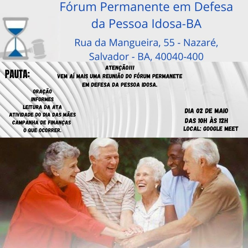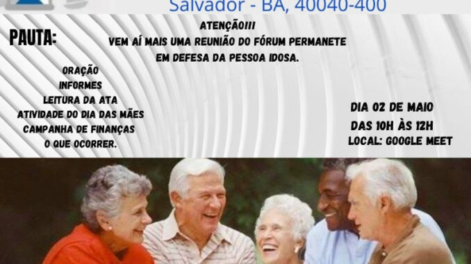 Fórum da Pessoa Idosa da Bahia marcou sua reunião mensal de maio em 2/5 29/04/2022 Hermínia Brandão AGENDA BRASIL, Bahia BA, NORDESTE Brasil e Região 0 O Fórum Permanente em Defesa da Pessoa Idosa da Bahia marcou a reunião de maio de 2022 para a segunda-feira, 2/5, presencial, das 10 às 11 horas. Aberto para as pessoas interessadas pelos direitos das pessoas idosas baianas. Fórum Permanente em Defesa da Pessoa Idosa da Bahia