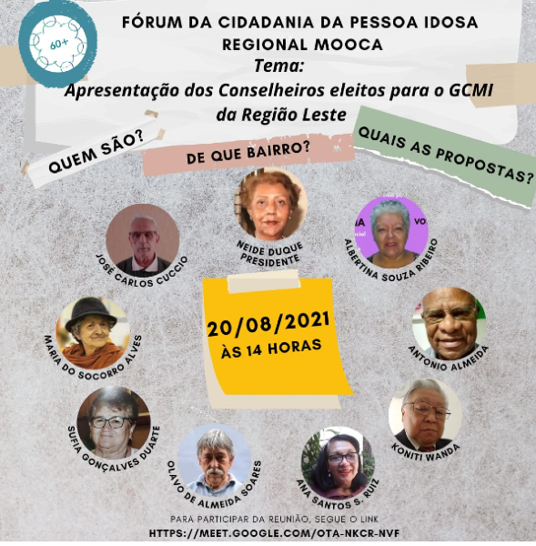 Fórum da Pessoa Idosa da Mooca, em São Paulo, faz seu encontro de agosto em 20/8 13/08/2021 Hermínia Brandão CONSELHOS E FÓRUNS DE IDOSOS SP, Mooca e Região- Capital SP 0 O Fórum da Cidadania da Pessoa Idosa da Mooca, na Zona Leste da Capital, em São Paulo, marcou sua reunião de agosto para o dia 20/8, a partir das 14 horas, ainda no formato virtual, através do Google Meet. Fórum da Cidadania da Pessoa Idosa da Mooca