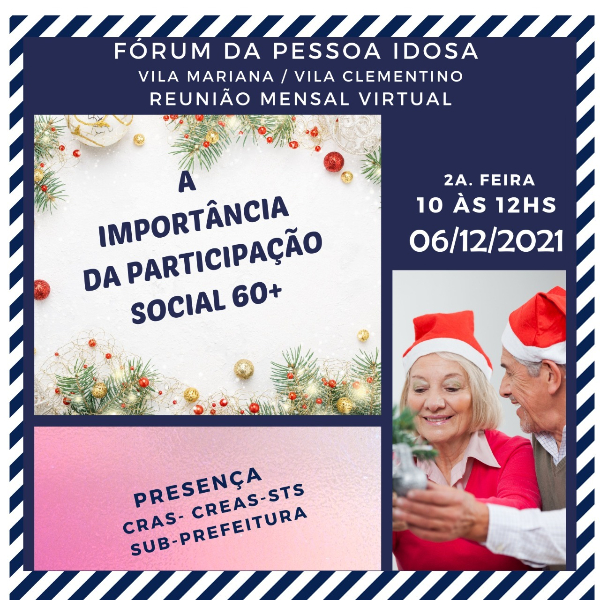 O Fórum da Pessoa Idosa da Vila Mariana e Vila Clementino, da Zona Sul da Capital, em São Paulo, faz hoje, segunda-feira, 6/12, a sua última reunião mensal de 2021, às 10 horas, ainda no formato virtual.