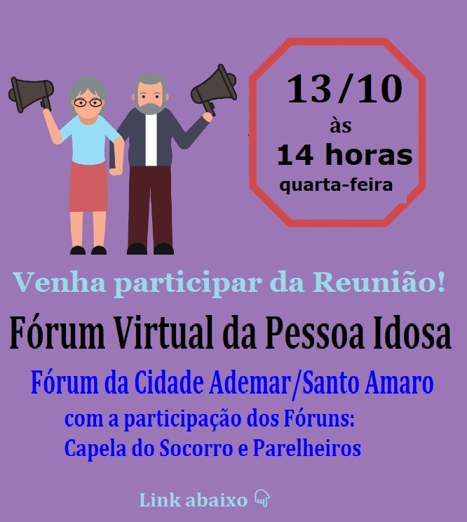 Fórum da Pessoa Idosa de Cidade Ademar e Pedreira de outubro será em 13/10 11/10/2021 Hermínia Brandão Capela do Socorro e Região - Capital SP, Cidade Ademar e Região - Capital SP, Parelheiros e Região- Capital SP 0 O Fórum da Pessoa Idosa de Cidade Ademar e Pedreira, da Zona Sul da Capital, em São Paulo, fará a sua reunião de outubro de 2021, na quarta-feira 13/10, às 14 horas. Na véspera será publicado o link. Fórum da Pessoa Idosa de Cidade Ademar e Pedreira