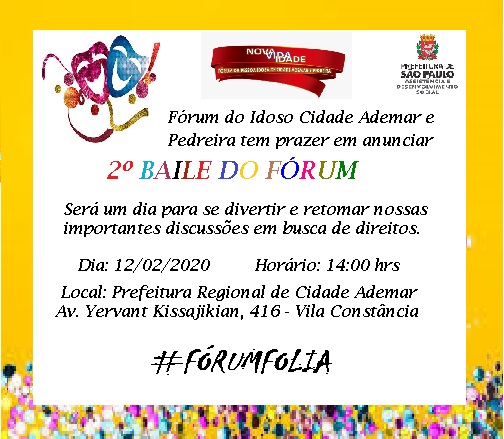 O Fórum da Pessoa Idosa de Cidade Ademar e Pedreira, da Zona Sul da Capital, em São Paulo, faz na próxima quarta-feira, dia 12 de fevereiro,  das 14 às 17 horas, na Av. Yervant Kissajikian, 416 – Vila Constância, na Subprefeitura de Cidade Ademar, o seu 2º Baile do Fórum, desta vez de Carnaval.