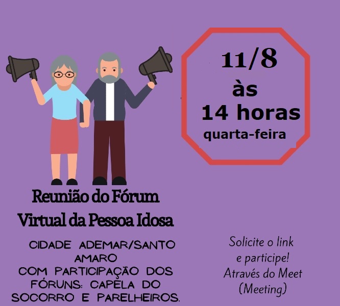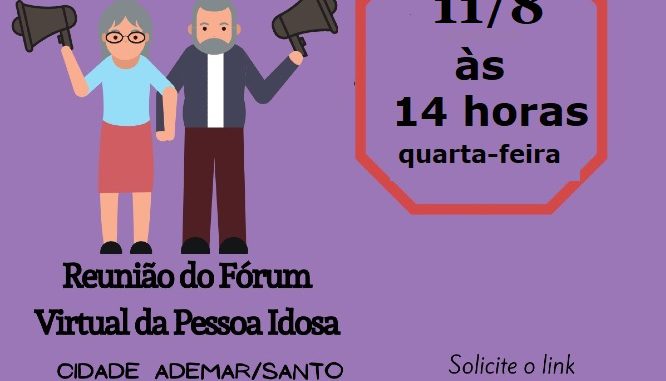 Fórum da Pessoa Idosa de Cidade Ademar e Pedreira, SP, faz sua reunião de agosto em 11/8 02/08/2021 Hermínia Brandão Capela do Socorro e Região - Capital SP, Cidade Ademar e Região - Capital SP, Parelheiros e Região- Capital SP 0 O Fórum da Pessoa Idosa de Cidade Ademar e Pedreira, da Zona Sul da Capital, em São Paulo, fará a sua reunião de agosto na quarta-feira, 11/8, às 14 horas. Na véspera será publicado o link. Fórum da Pessoa Idosa de Cidade Ademar e Pedreira