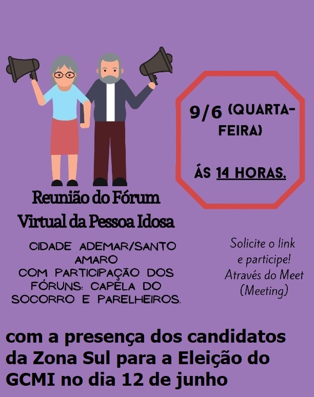 O Fórum da Pessoa Idosa de Cidade Ademar e Pedreira, da Zona Sul da Capital, em São Paulo, marcou sua reunião virtual de junho para a quarta-feira, 9/6, às 14 horas.