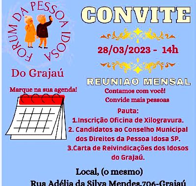 O Fórum da Pessoa Idosa do Grajaú marcou sua reunião mensal de março para a próxima sexta-feira, 28/3, ao lado da Escola Estadual Irmã Charlita.