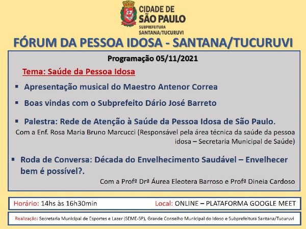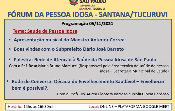 Fórum da Pessoa Idosa Santana/Tucuruvi, SP, falará de Saúde na sua reunião em 5/11 01/11/2021 Hermínia Brandão CONSELHOS E FÓRUNS DE IDOSOS SP, Santana/Tucuruvi- Capital SP 0 O Fórum da Pessoa Idosa Santana/Tucuruvi faz na próxima sexta-feira, 5/11, a partir das 14 horas, sua reunião mensal, ainda no formato virtual. O link: https://meet.google.com/kkx-oqcz-fjx Fórum da Pessoa Idosa Santana/TucuruviFórum Santana/Tucuruvi
