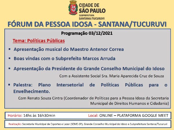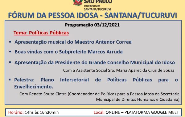 O Fórum da Pessoa Idosa Santana/Tucuruvi faz a sua última reunião mensal de 2021, na sexta-feira, 3/12, a partir das 14 horas, ainda no formato virtual.