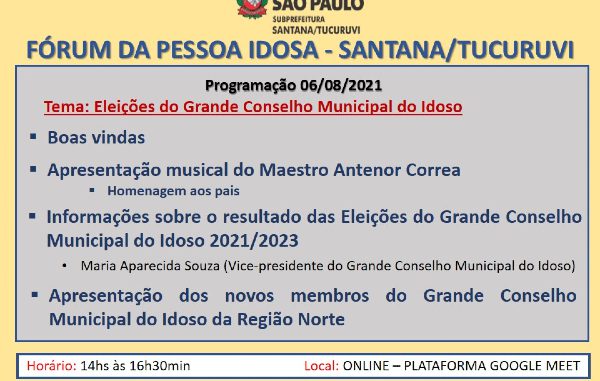 Fórum da Pessoa Idosa Santana/Tucuruvi, SP, faz sua reunião de agosto de 2021 em 6/8 02/08/2021 Hermínia Brandão Santana/Tucuruvi- Capital SP 0 Parte do grupo que se reuniu no Fórum Santana Tucuruvi em 6 de setembro de 2019. Foto: jornal3idade.com.br O Fórum da Pessoa Idosa Santana/Tucuruvi marcou a sua reunião de agosto de 2021, para a sexta-feira dia 6, das 14 às 16h30m, virtual. O link aberto para todas as pessoas interessadas. Fórum Santana/Tucuruvi