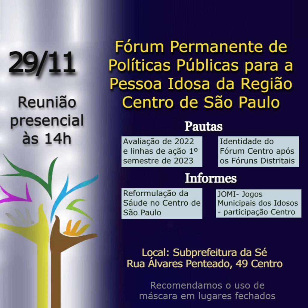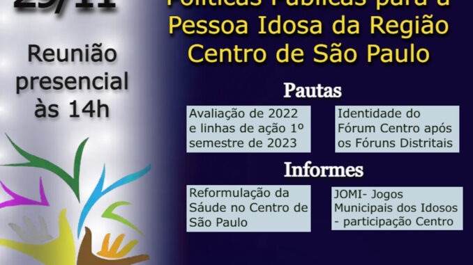 O Fórum Permanente de Políticas Públicas Para Pessoas Idosas da Região Centro, da Capital, em São Paulo, marcou para a próxima terça-feira, 29/11, das 14 às 16h30, a última reunião presencial de 2022.