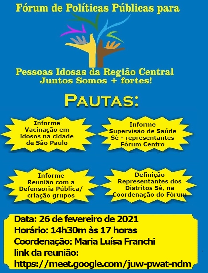 O Fórum Permanente de Políticas Públicas Para Pessoas Idosas da Região Centro, da Capital, em São Paulo, marcou a reunião de fevereiro para a próxima sexta-feira, 26/2, das 14h30 às 17 horas.
