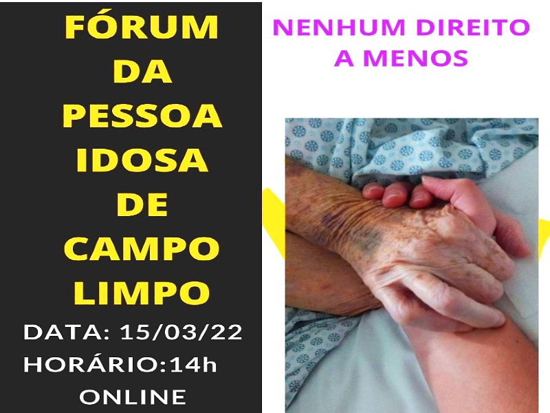 Fórum do Campo Limpo faz hoje 15/3 seu encontro mensal, ainda no formato virtual 15/03/2022 Hermínia Brandão Campo Limpo e Região - Capital SP 0 O Fórum do Idoso do Campo Limpo faz hoje sua reunião mensal, ainda no formato virtual, a partir das 14 horas. Aberto para quem se interessar em participar, principalmente quem tiver contribuições sobre demandas sobre a pessoa idosa no território. Link: https://meet.google.com/tbi-fqxq-sen Campo Limpo e RegiãoFórum do Idoso do Campo Limpo