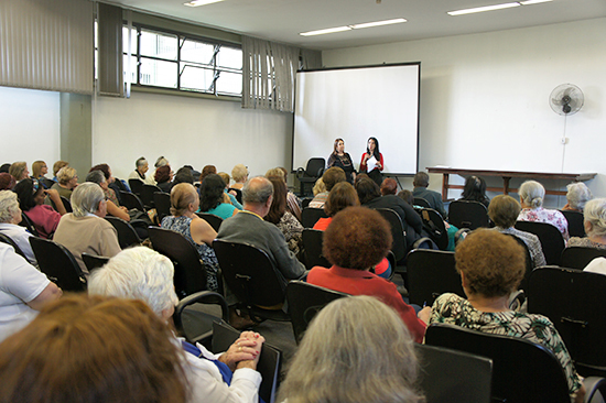Auditório da Subprefeitura do Tucuruvi lotado para a comemoração dos 16 anos do Fórum do Cidadão Idoso Santana/Tucuruvi. Apresentação da coordenadora Dineia Cardoso apresentando a palestrante Roberta Lídice. Foto: jornal3idade.com.br